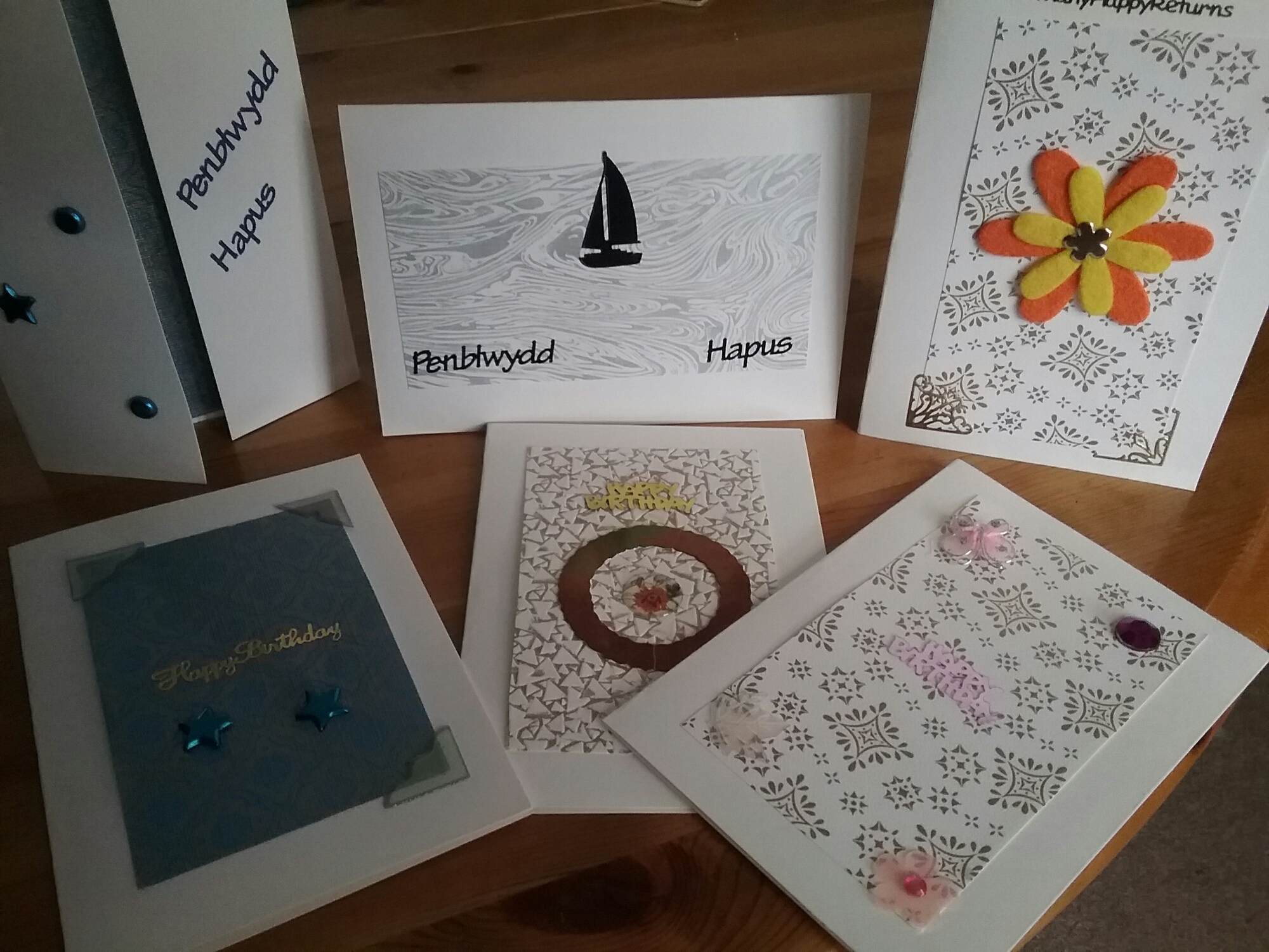 These are 6 newly made hand crafted cards. I can also make cards to order. These cards are available from £2 – £2:50 each plus postage. Made to order would depend on size, lettering etc but similar price.
