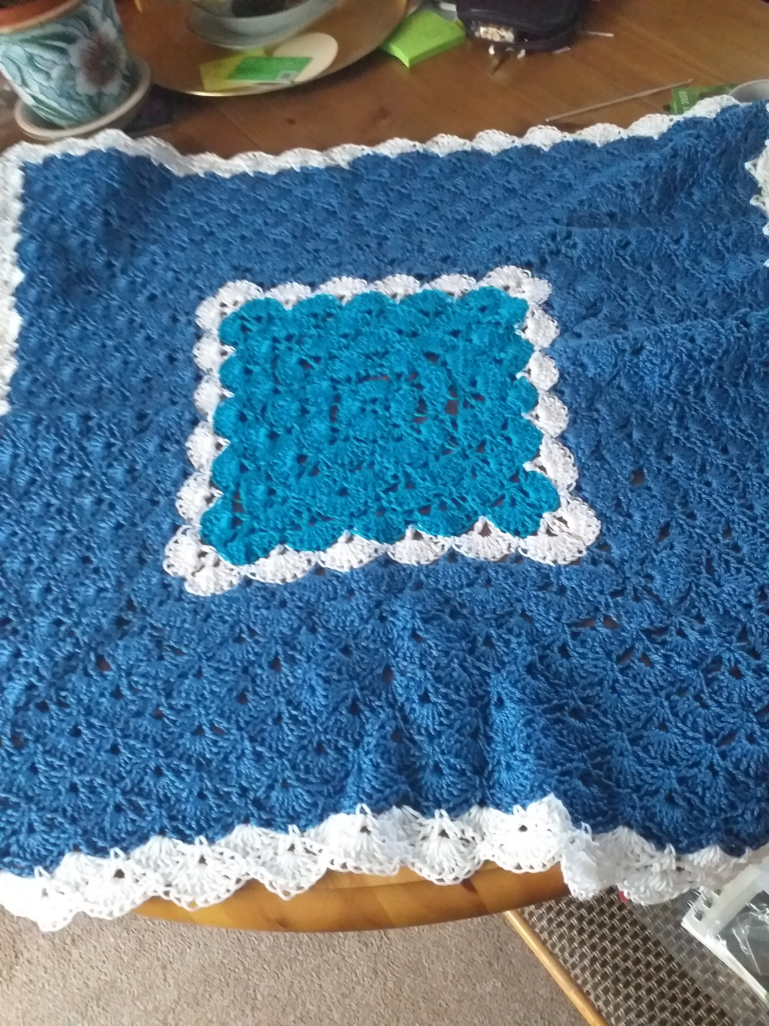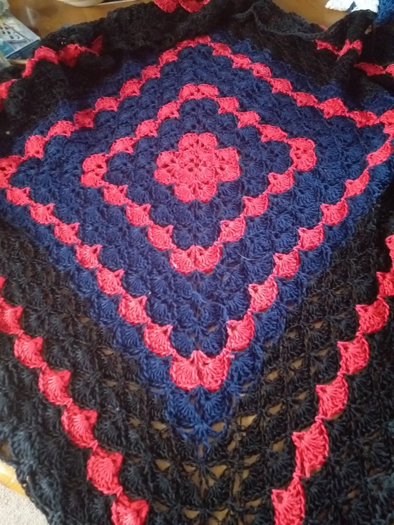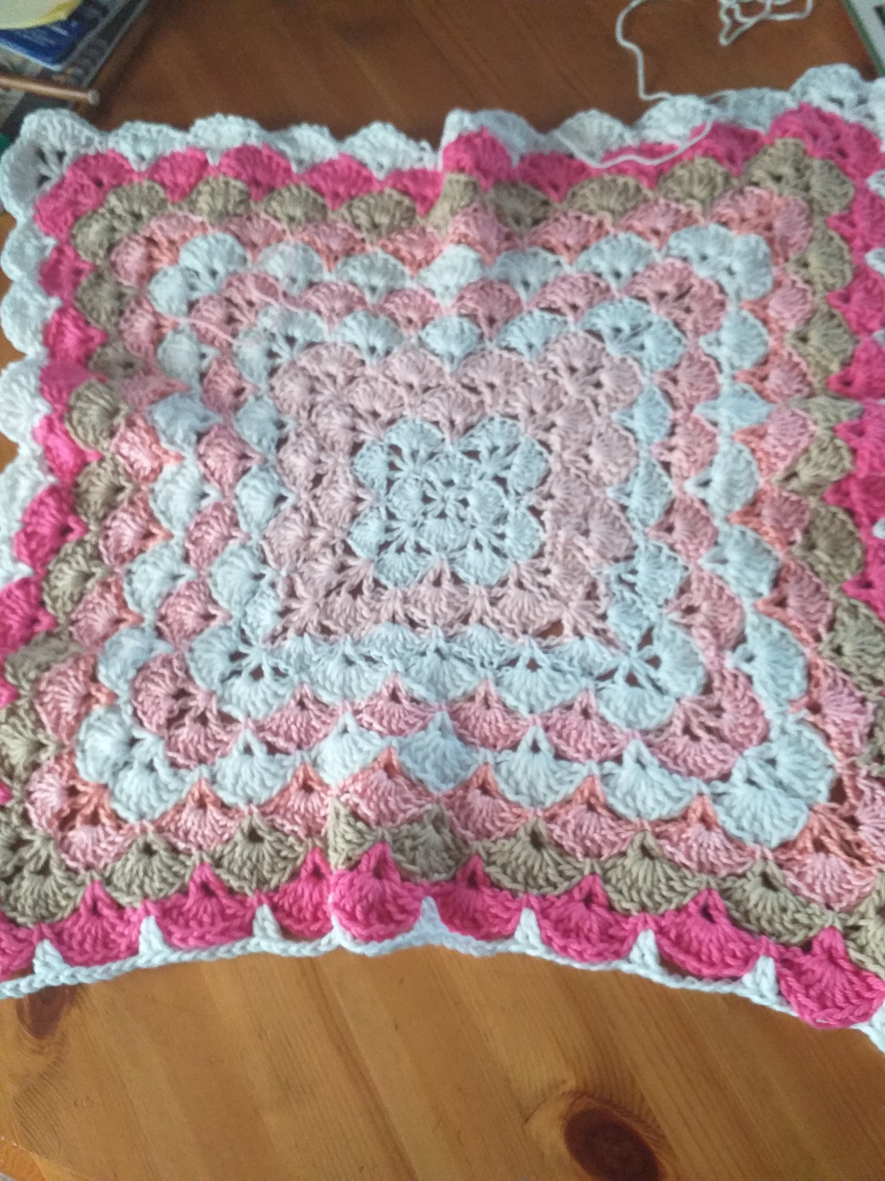 I looked for patterns, couldn’t find anything so decided to look on you tube. I typed in shell stitch as it was a favourite for making baby blankets, my mother used to do them. Found a pattern with an American accent, struggled at first to follow her instructions but this is what followed